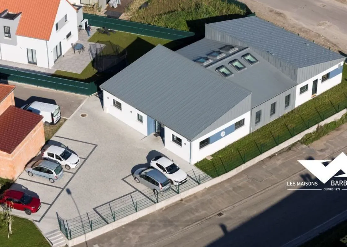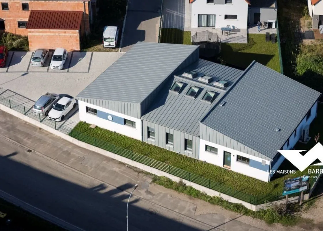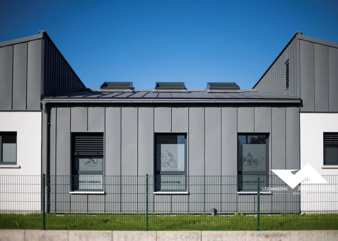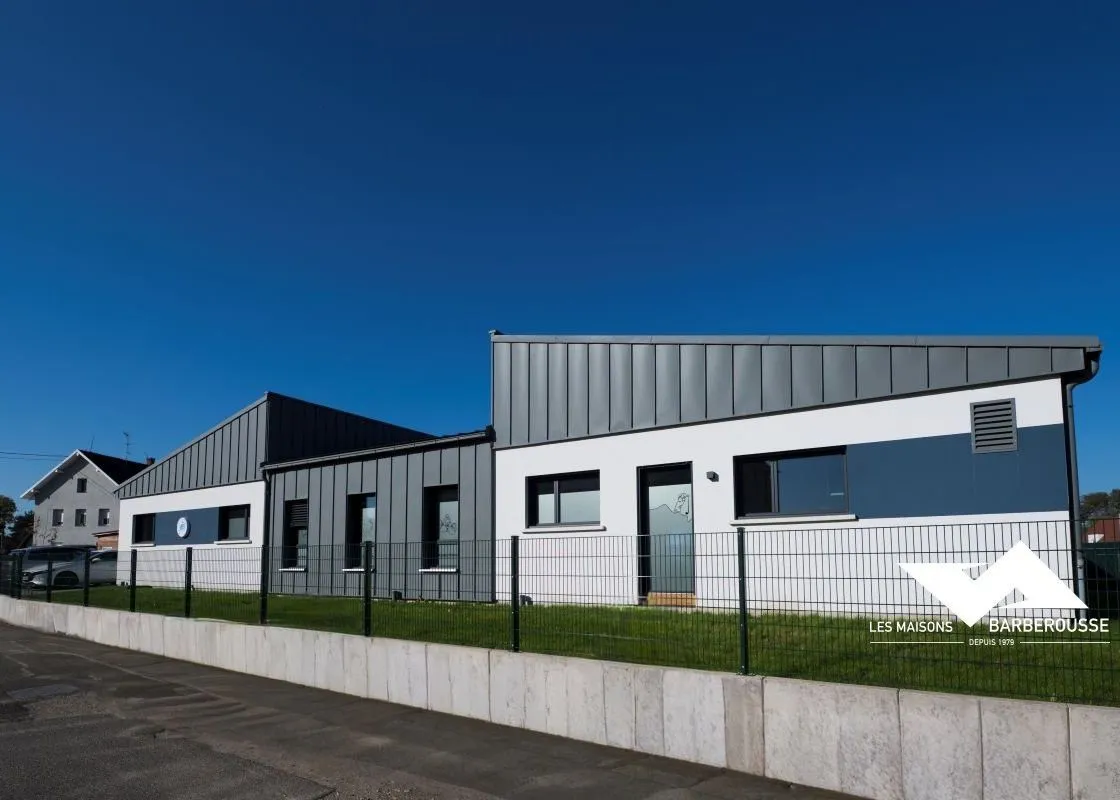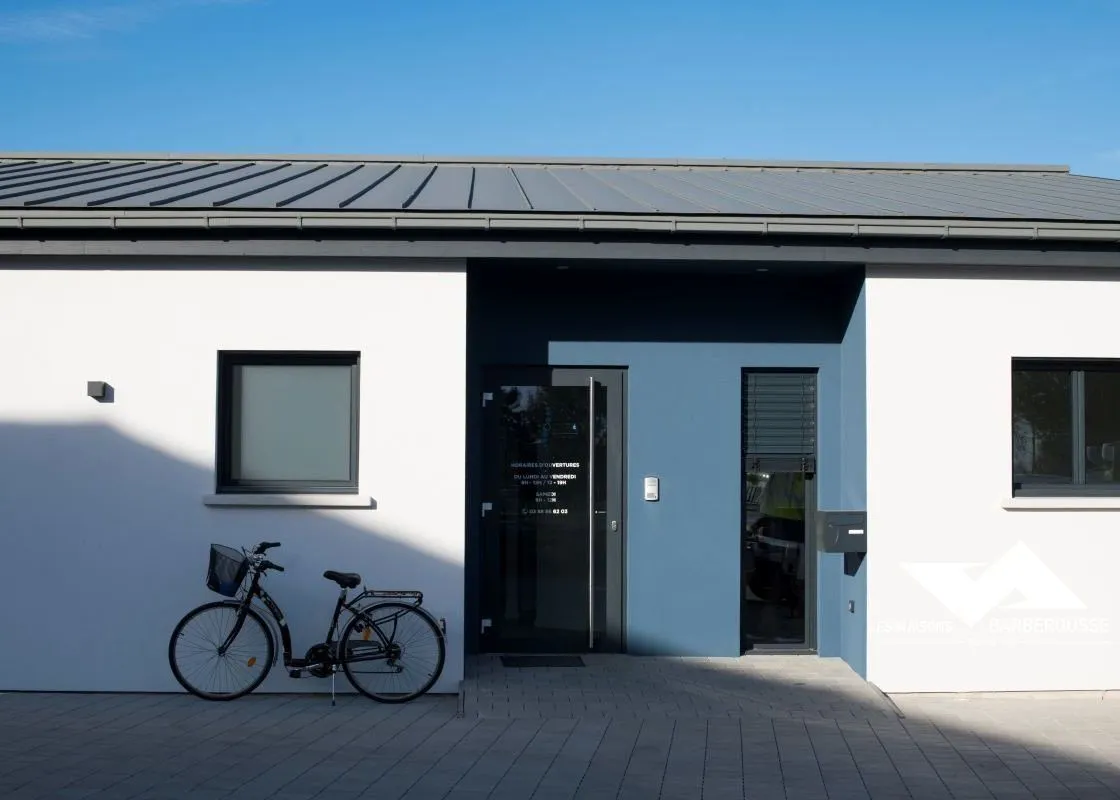L’architecture mêle volumes contemporains et finition soignée : bardage gris, enduit blanc et touches de bleu pour une identité sobre et professionnelle.