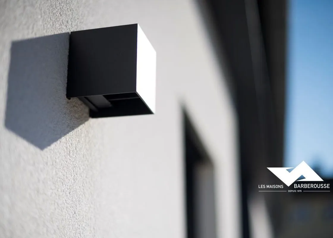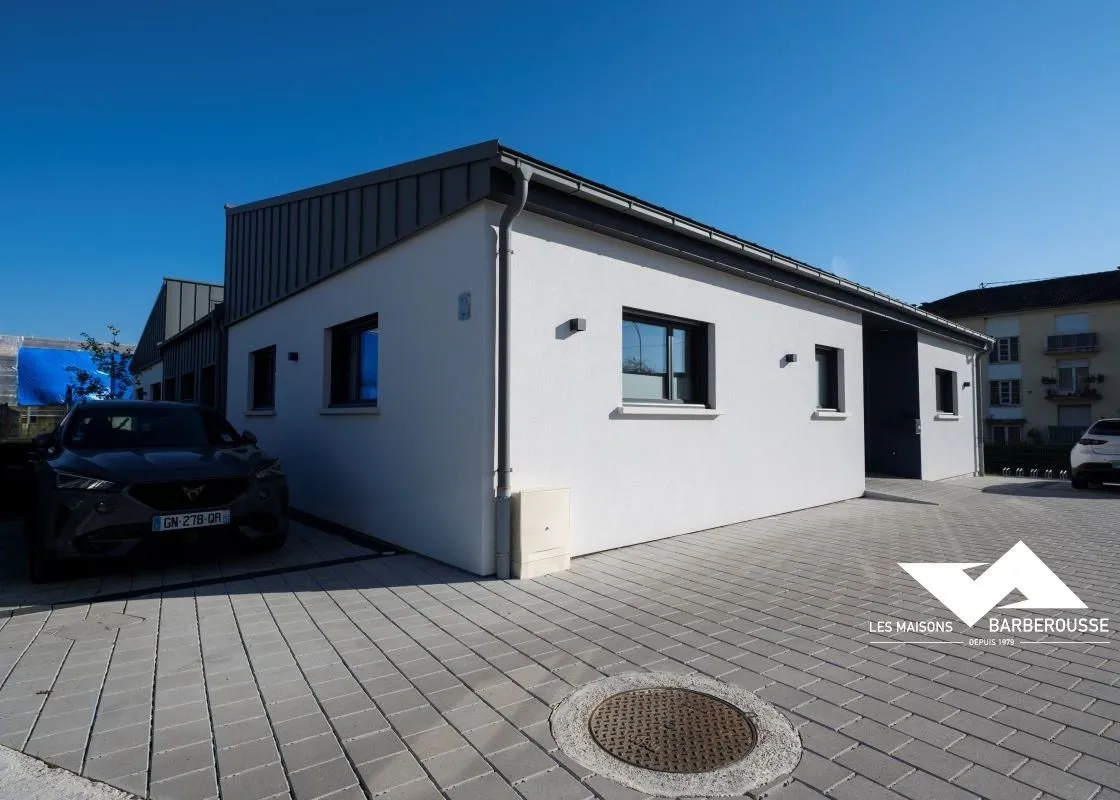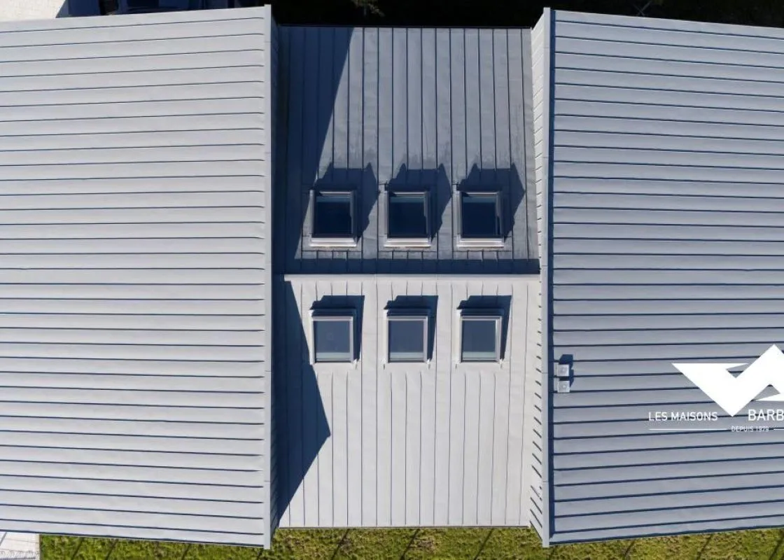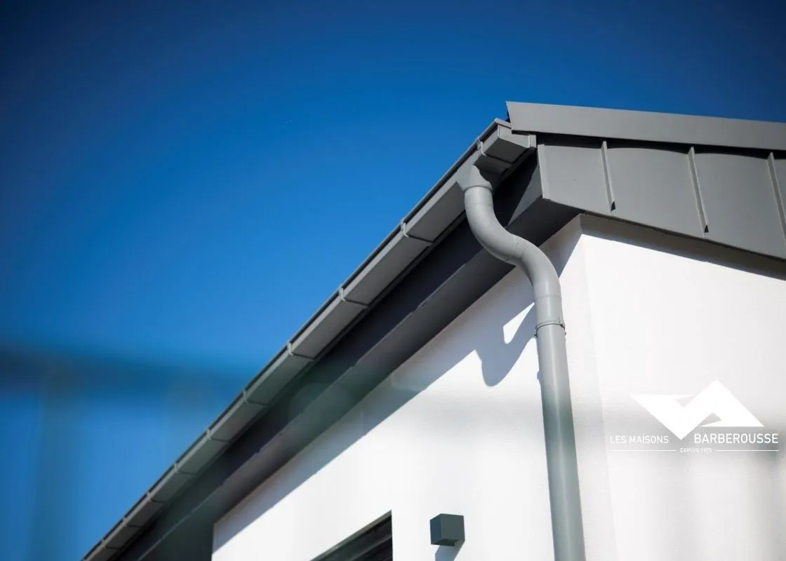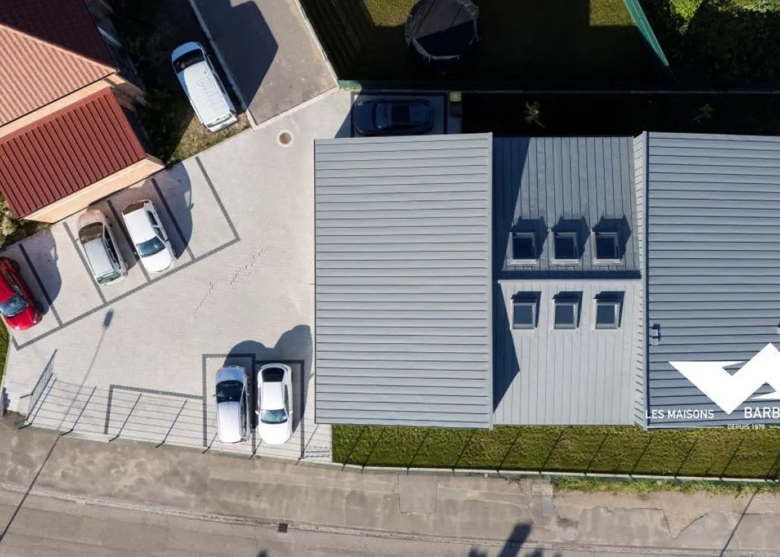 L’architecture mêle volumes contemporains et finition soignée : bardage gris, enduit blanc et touches de bleu pour une identité sobre et professionnelle.