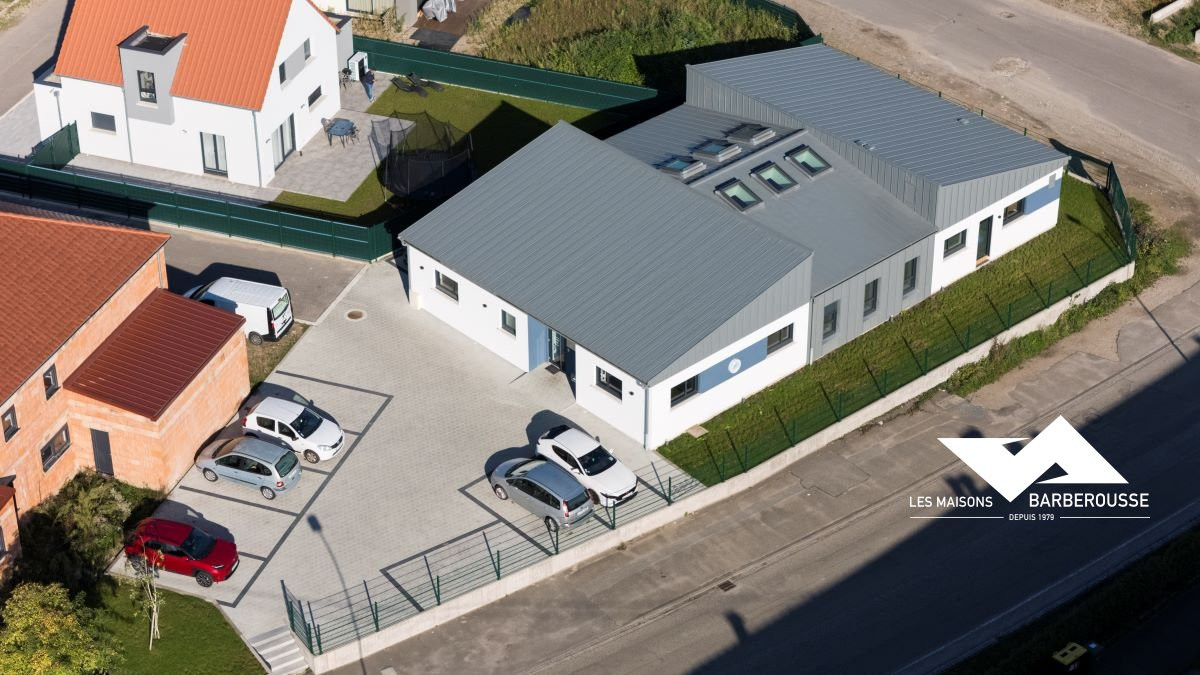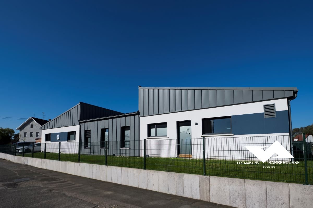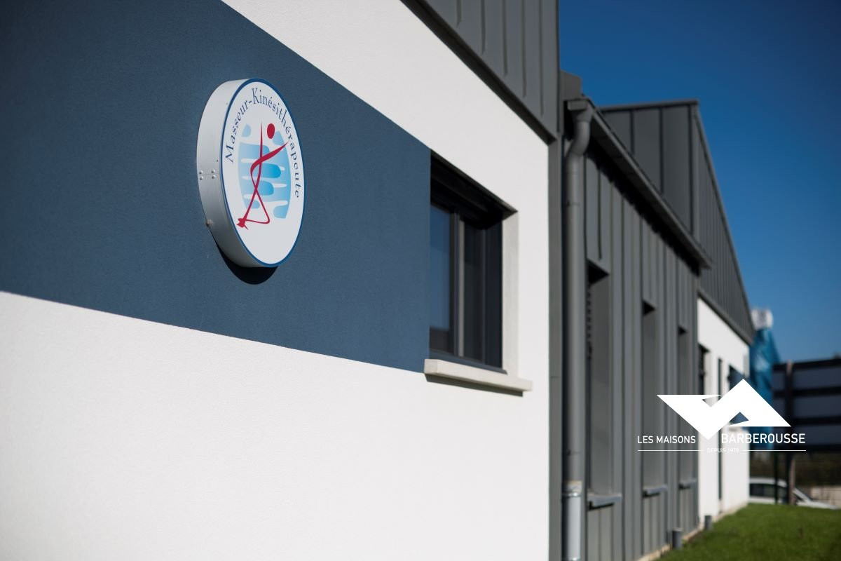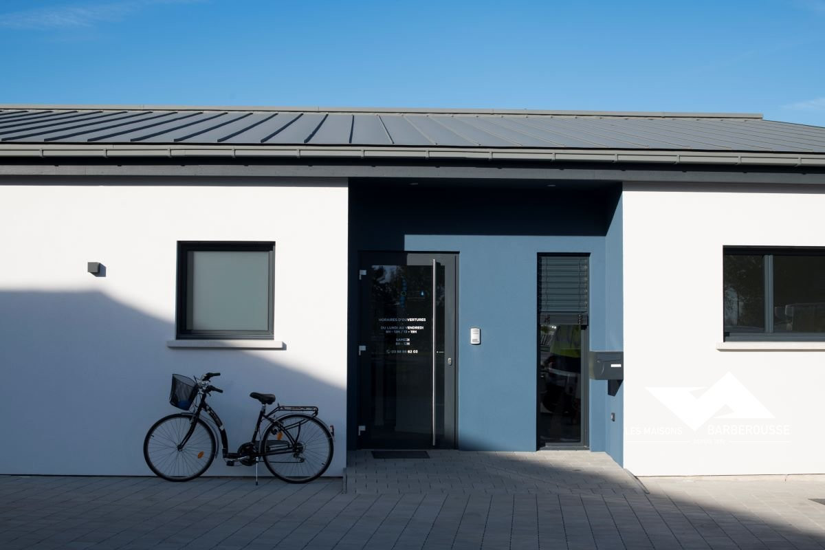 L’architecture mêle volumes contemporains et finition soignée : bardage gris, enduit blanc et touches de bleu pour une identité sobre et professionnelle.