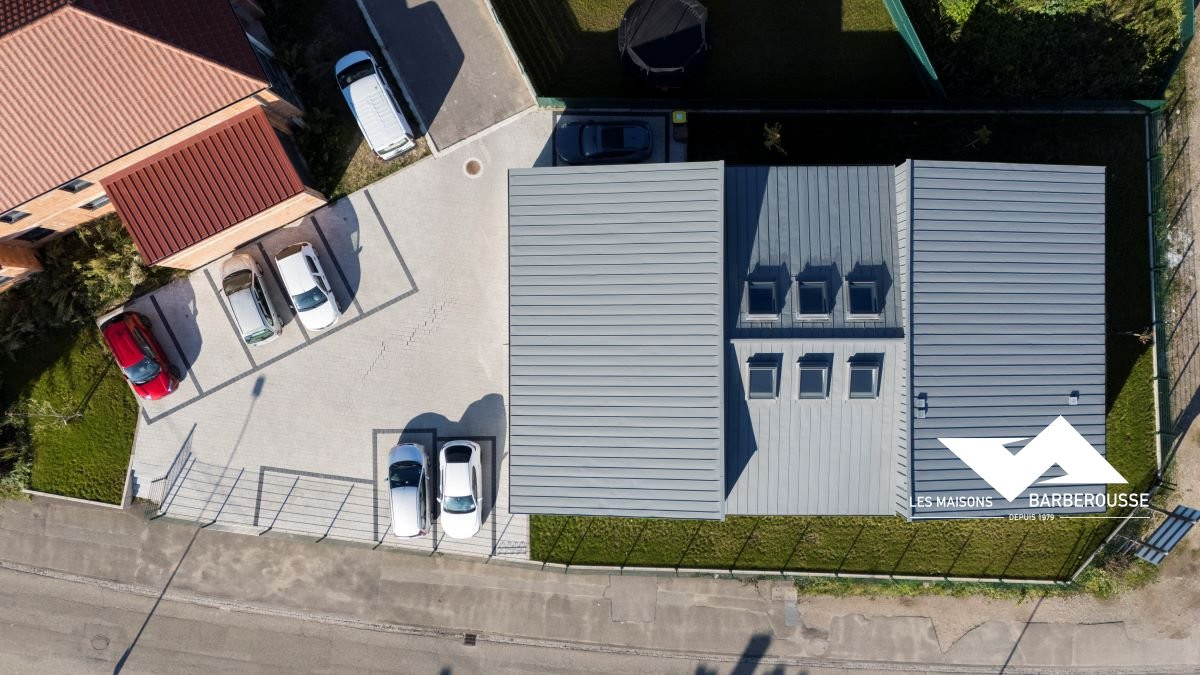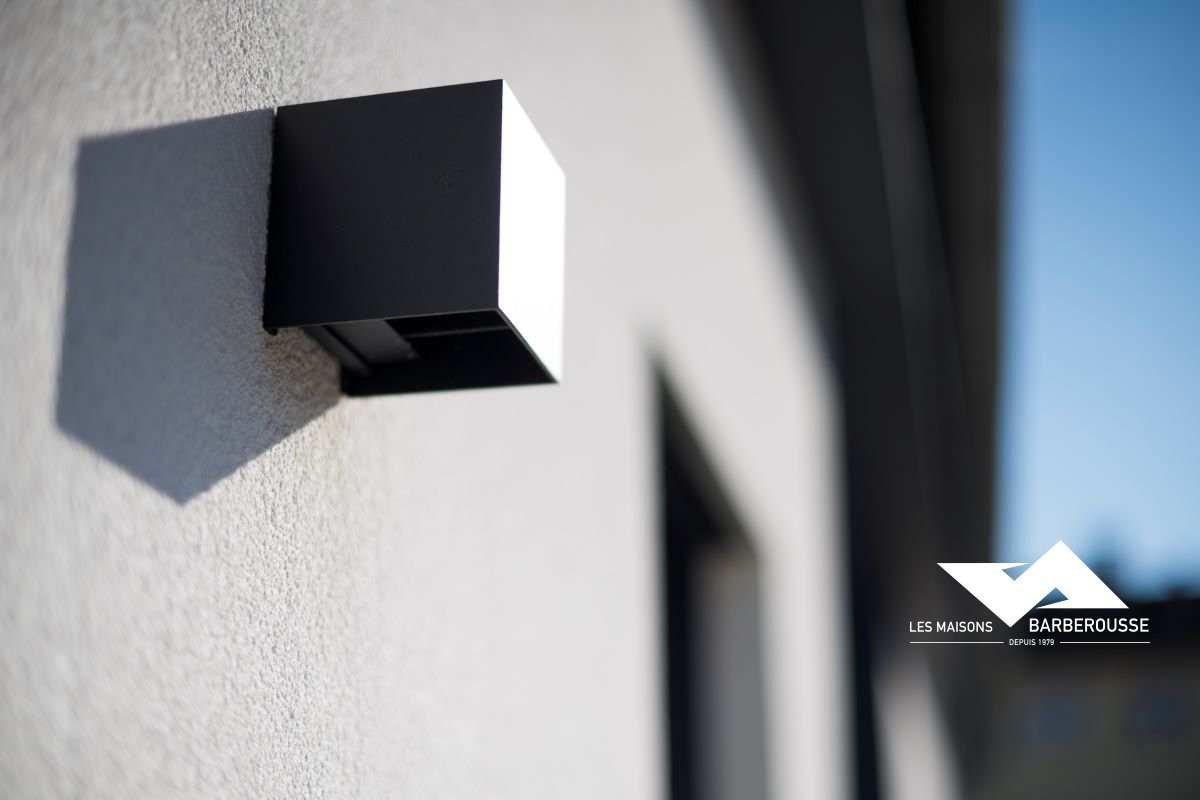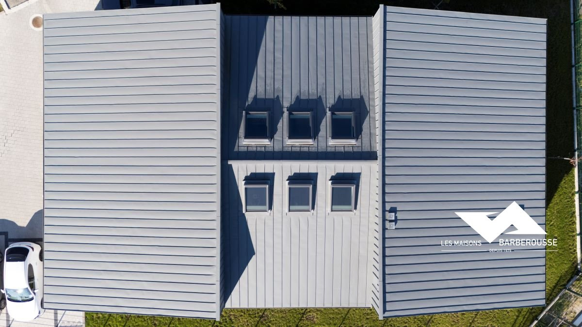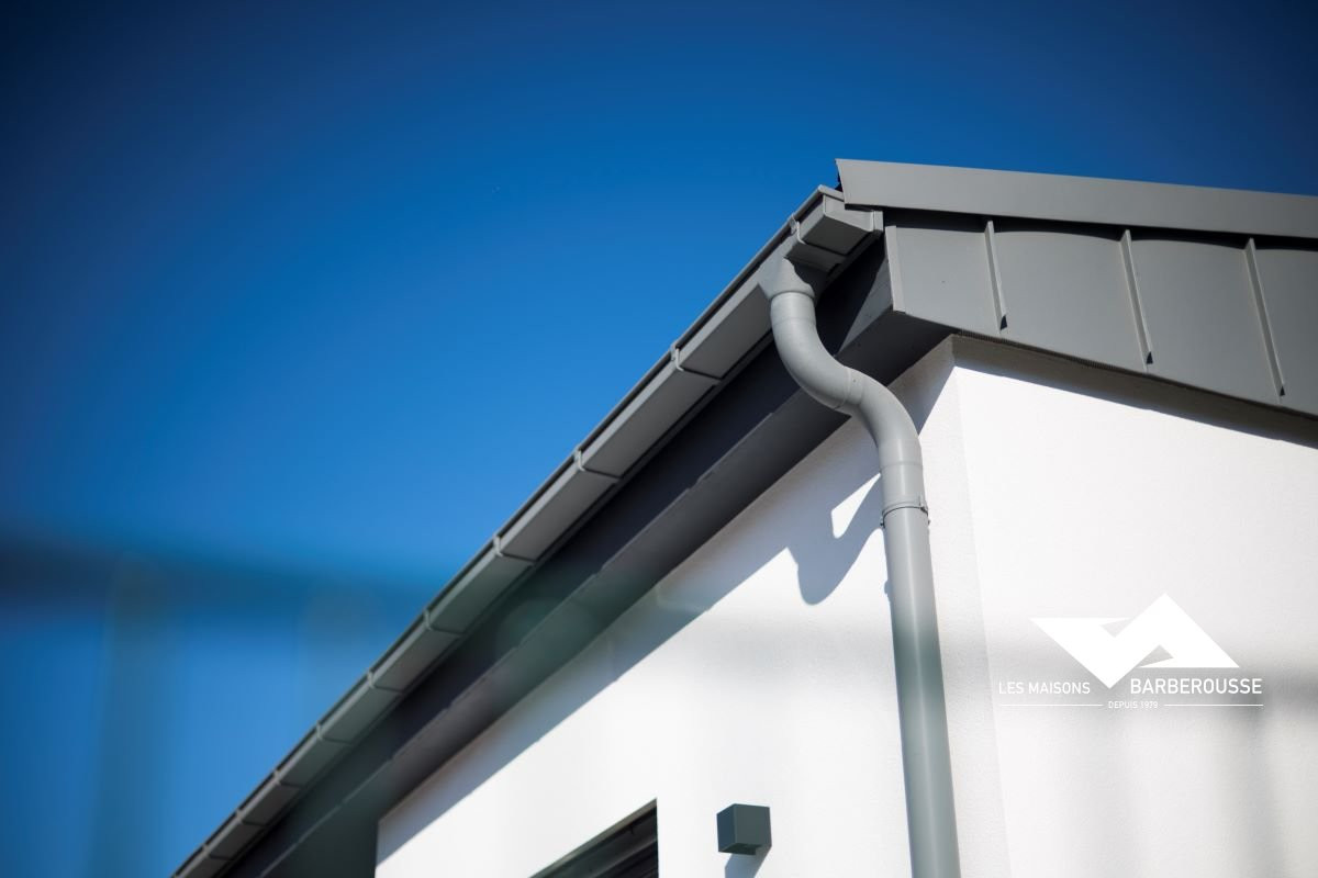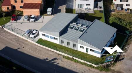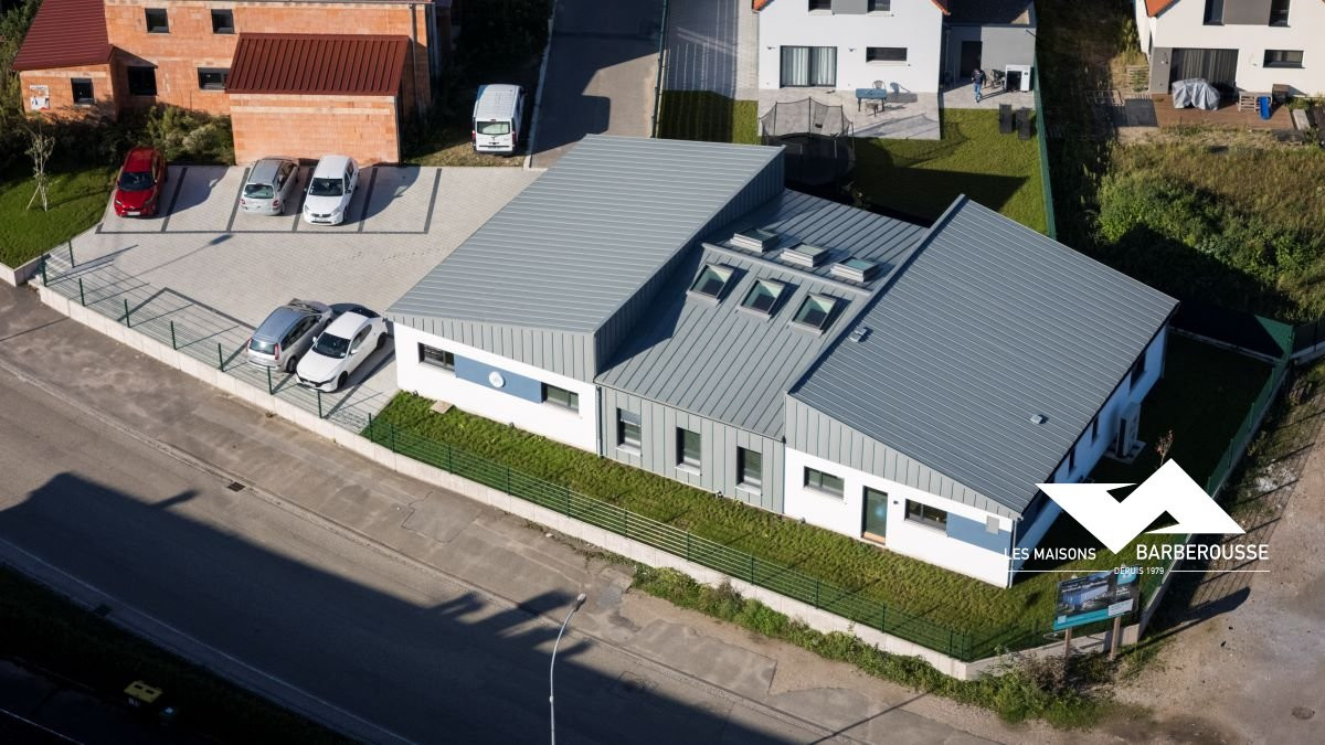 L’architecture mêle volumes contemporains et finition soignée : bardage gris, enduit blanc et touches de bleu pour une identité sobre et professionnelle.